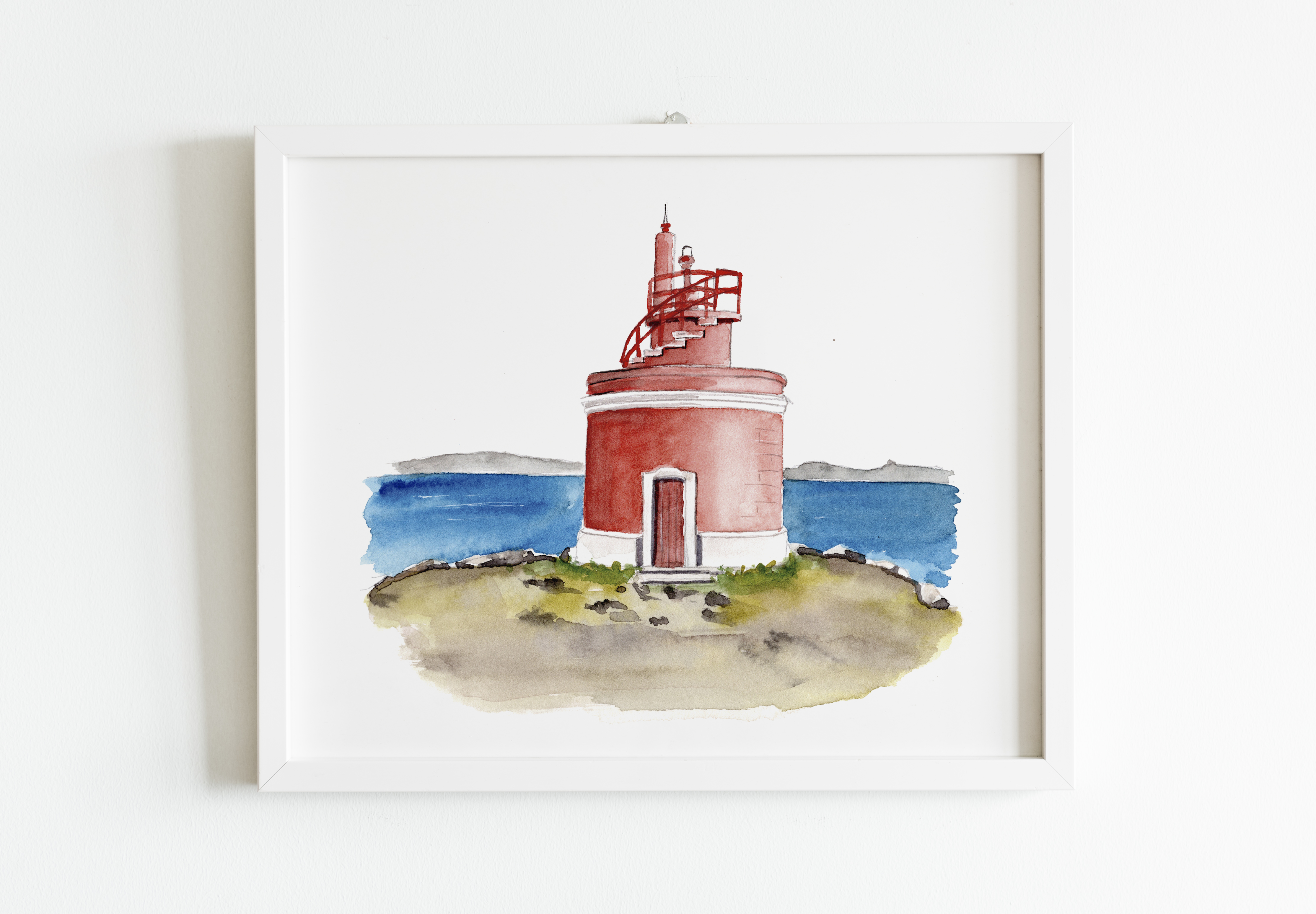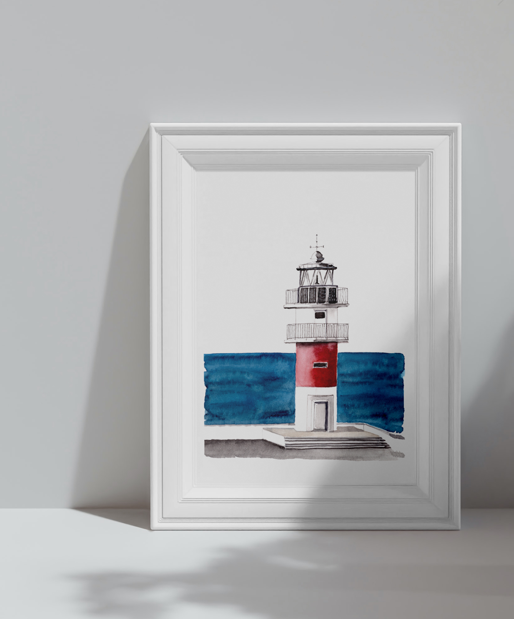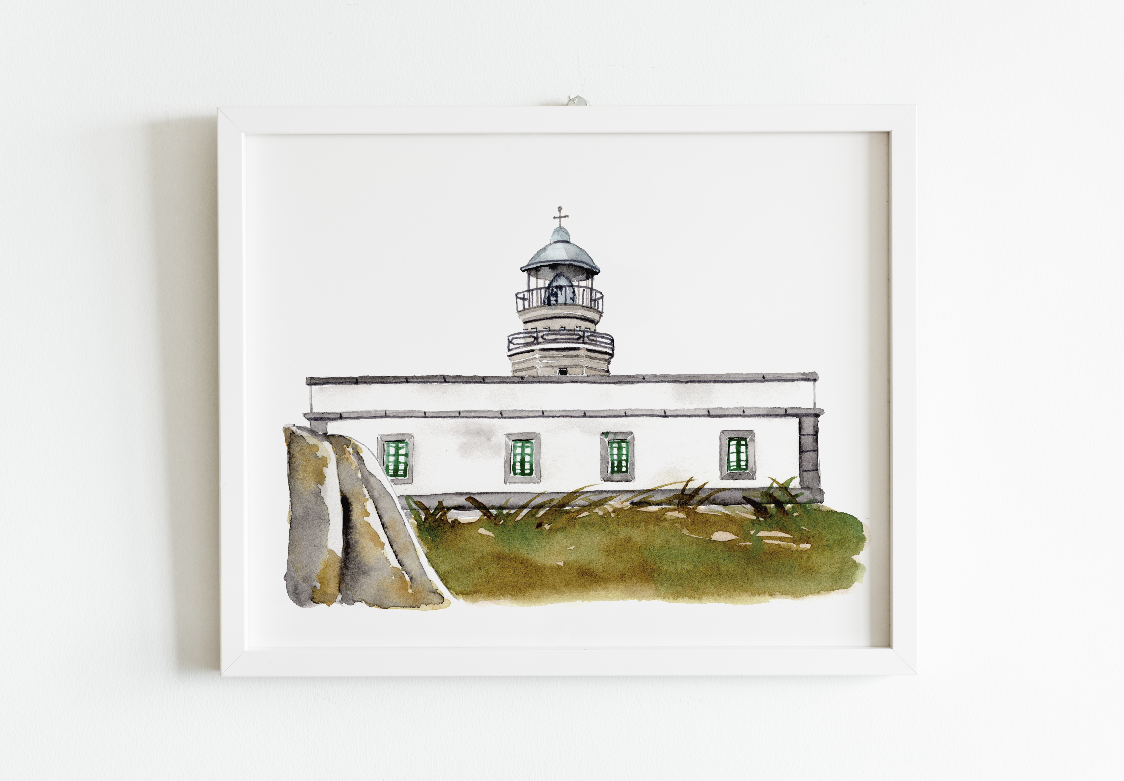 Reproducciones digitales de acuarelas hechas a mano de los faros de Cabo Vilán, Corrubedo, Illa de Ons, Cabo Home, Cabo Ortegal, Sisargas, Punta Robaleira y Fisterra.